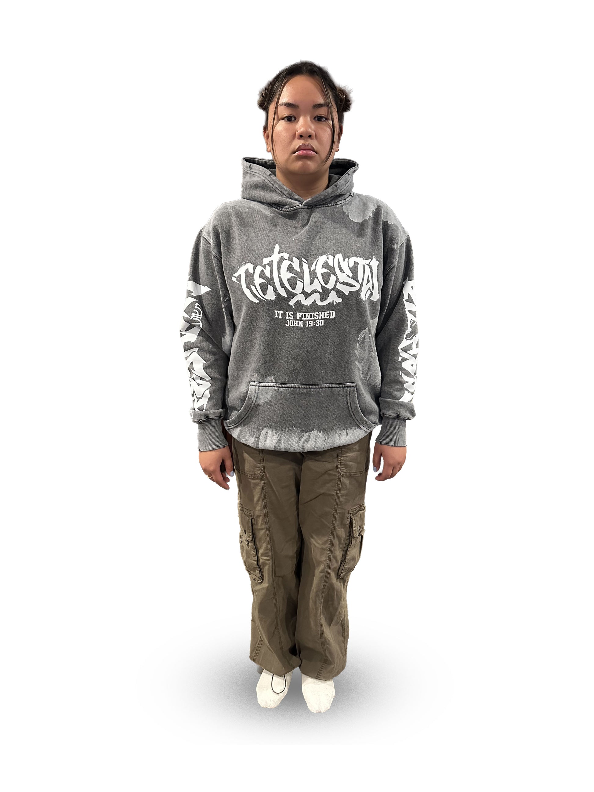 Tetelestai Deep Fog Grunge Hoodie | John 19:30 Christian Streetwear | Yeshua Sleeve Faith Hoodie
